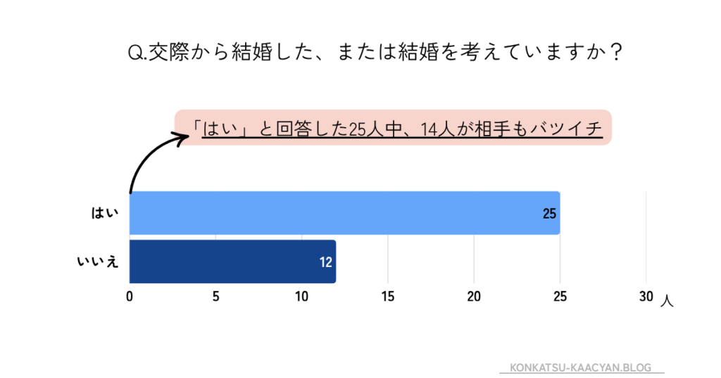 アンケートの質問「婚活パーティーで結婚した、または結婚を考えていますか?」に対し「はい」が25人と半数以上が交際から結婚へと進展しています。