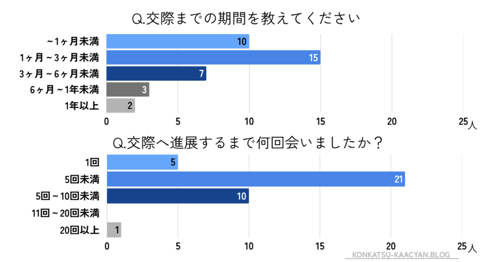 婚活パーティーで出会ってから交際までの期間と会った回数を調査しました。