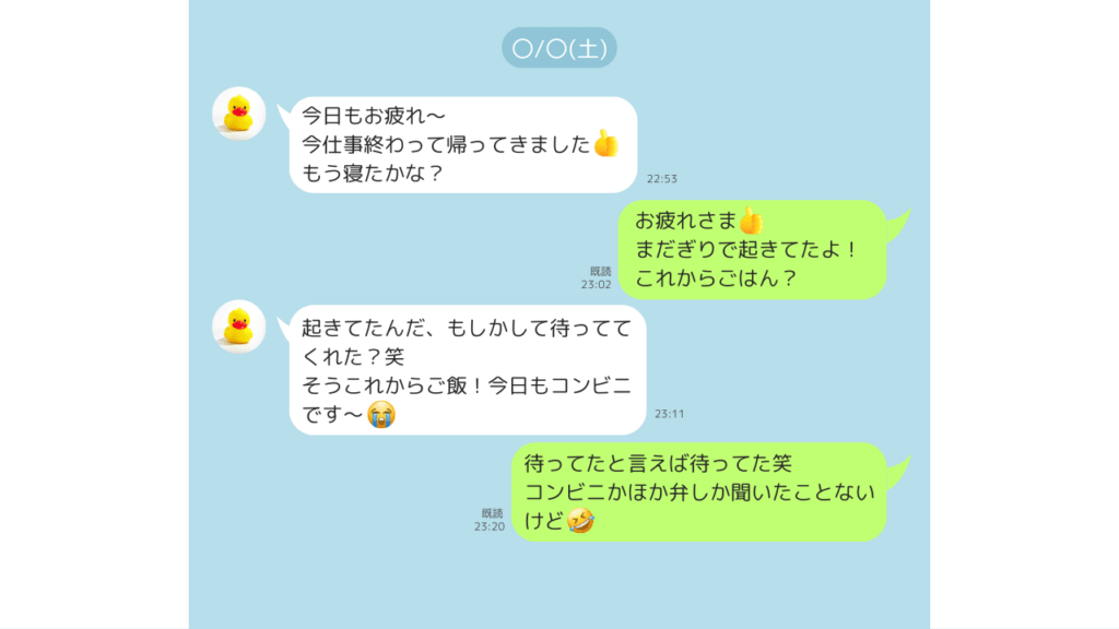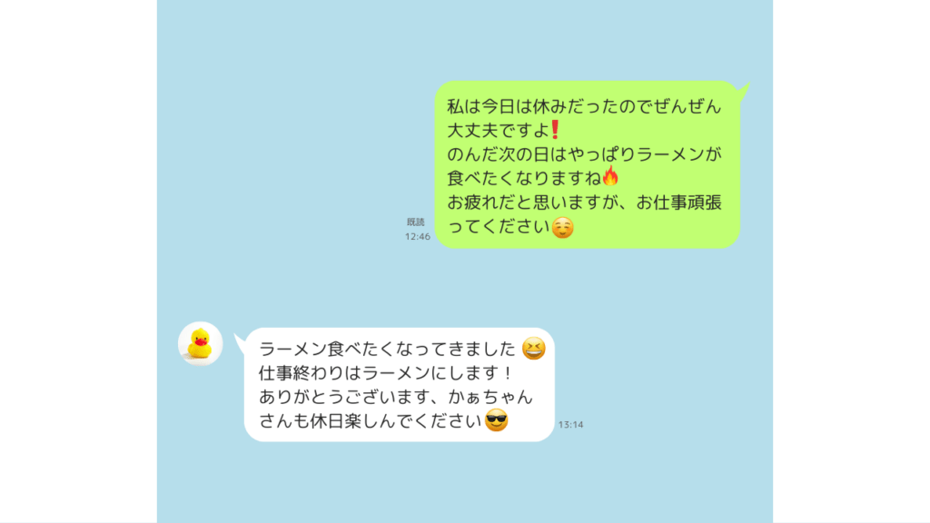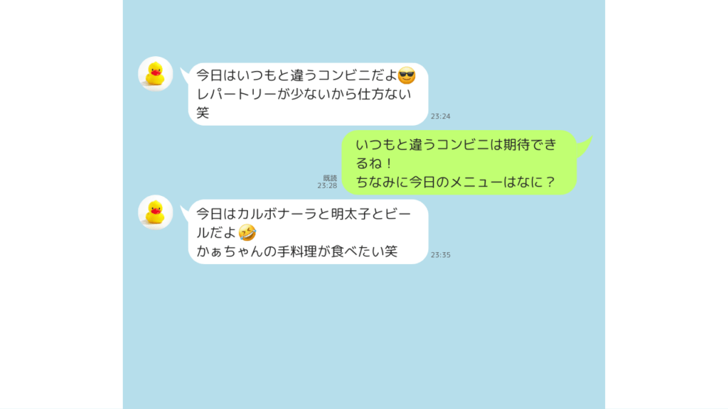 のような日常の話題がメインでしたね。夜にやり取りすることがほとんどだったので、食べ物の話題が多かったです。
