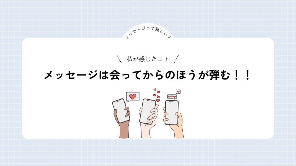 1度も会っていない状態でメッセージをつづけるのって、ハードモードすぎません?相手の印象や話し方、雰囲気も分からずメッセージを交わすのって本当に難しいと私は思います。
