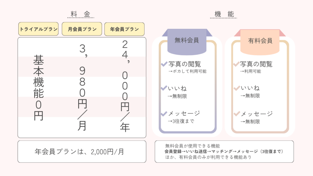 - 男性を有料にすることで本気度の高いユーザーを集め、女性とマッチングしやすい環境を整える